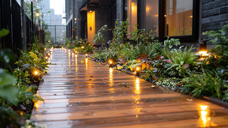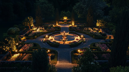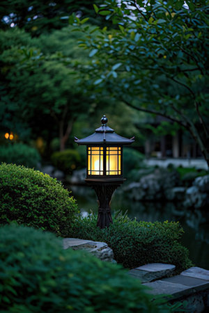 Softly glowing lanterns light up a serene garden pathway during a peaceful evening atmosphere.