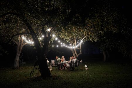 A secluded spot. Evening time. Friends have a dinner in the gorgeous outdoor place.