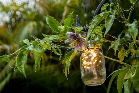 Purple passionflower called Passiflora incarnate blooms on a post with a fairy garden mason jar light glowing in Sarasota, Florida.