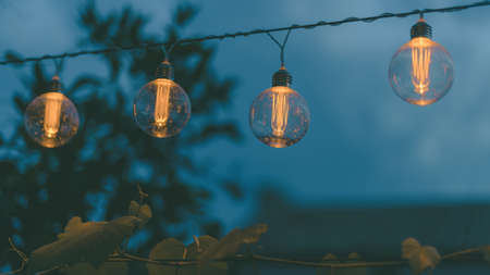 Hanging light bulbs in outdoor terrace in the garden. Patio lighting decoration concept, summer time