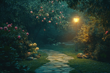 A tranquil garden path is illuminated by a lantern, with blooming flowers surrounding the serene walkway at dusk.