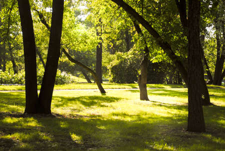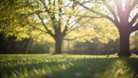 Bright sunlight lights up a green park of trees and grass, creating a vibrant springtime outdoor scene.