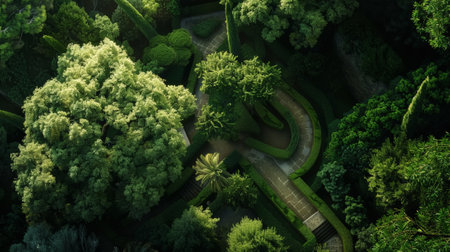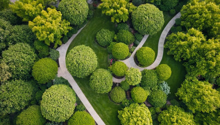 This overhead shot captures the intricate beauty of a well-maintained garden from an aerial viewpoint. Winding, light-colored pathways meander through a vibrant tapestry of green. Perfectly sculpted, spherical shrubs are interspersed with taller, leafy trees, creating a dynamic and textured landscape. The scene is dominated by various shades of green, from the deep emerald of the manicured lawns to the brighter, almost lime green of some of the foliage. The overall impression is one of...