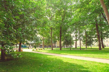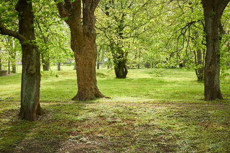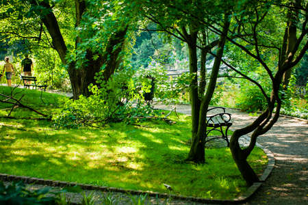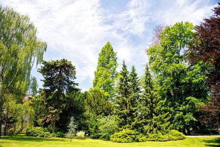 Park with green trees, spruce, pine, plants and grass in Prague, Czech Republic, on sunny day on natural landscape. Nature beauty and growth concept.