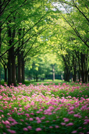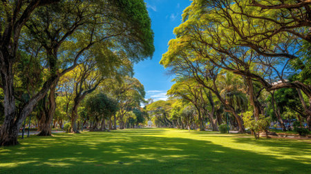 A stunning park pathway lined with majestic trees creates a serene atmosphere. The vibrant greenery and bright blue sky invite visitors to relax and enjoy nature.