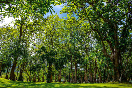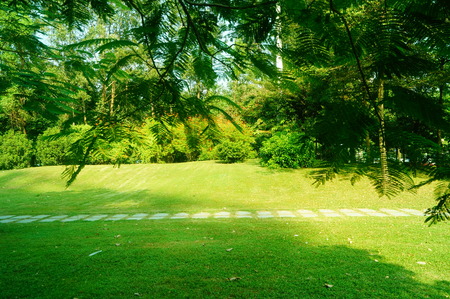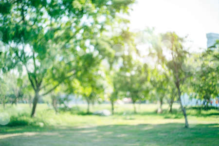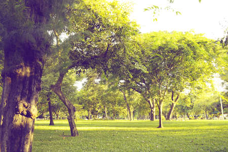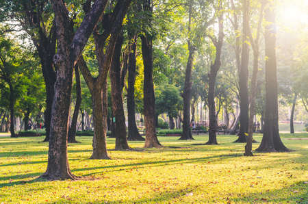 trees in the park with green grass and sunlight, fresh green nature background at out door in city for relax area good breath healthy. green environment garden ozone oxygen save world.