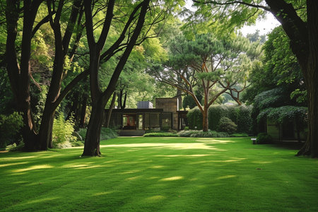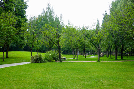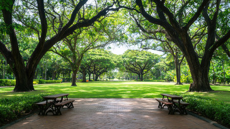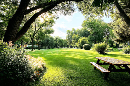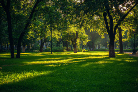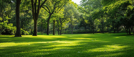 Tranquil Park Landscape with Lush Green Trees, Vibrant Lawn, and Peaceful Shadows for Relaxation
