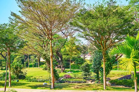 Relax in shade of lush trees of Theingottara park, located next to the Shwedagon Pagoda, Yangon, Myanmar