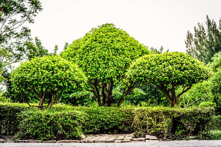 Group of greenery trees in a smooth green grass lawn in good care maintenance garden in the park