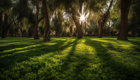 Tranquil scene of nature beauty green meadow, tree, sunlight generated by artificial intelligence