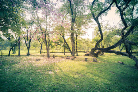 Public park with Pink trumpet trees or Tabebuia rosea flowers fall all over the green grass in the morning, sakura trees and green lawn in park.