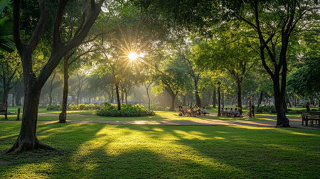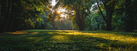 A serene scene in a lush green park, with sunlight filtering through tall trees, creating a peaceful and refreshing atmosphere perfect for nature and outdoor themes.