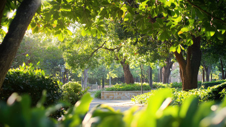 A stunning view of a green pathway lined by bright trees, basking in natural sunlight. This inviting scene showcases the beauty and tranquility of nature.