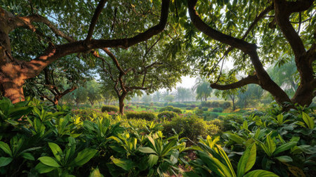 Serene Landscape of Lush Greenery with Majestic Trees and Soft Sunlight Filtering Through Leaves