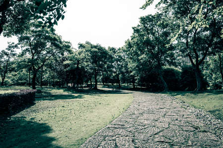 Park tree in the morning with footpath pathway with green plant and flower wood tree, beautiful city park garden nature environment