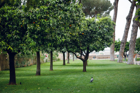 Lush green lawn with mature orange trees bearing fruit, set against a backdrop of tall pine trees and ancient Roman architecture