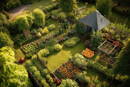 aerial view of a colorful, well-maintained vegetable garden, created with generative ai
