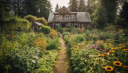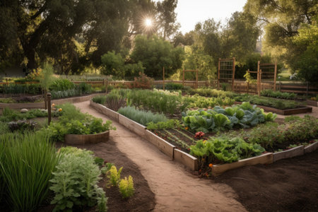 edible landscape with fruit trees and vegetable garden, created with generative ai