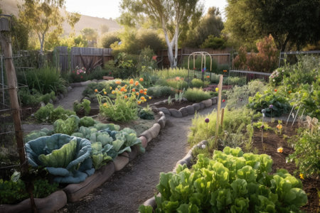 garden with a permaculture design, with plants and growing techniques that promote biodiversity generative ai