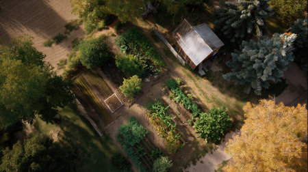 This aerial image captures a vibrant garden filled with a variety of vegetables, framed by lush greenery and a quaint garden shed. The rustic setting emphasizes sustainable agriculture and the beauty of nature.