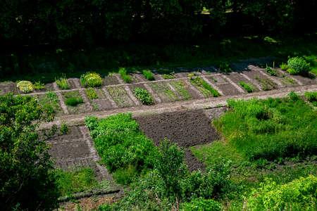 botanical garden bed with bushes and flowers for experimental cultivation and plant breeding growth of new plants, view on spring green nature with plowed soil, agricultural fields top view, nobody.