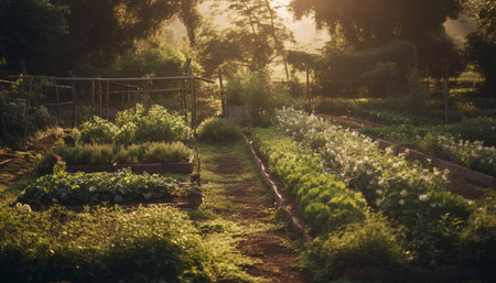 Soft light illuminates a flourishing garden full of blooming flowers and lush vegetables, creating a peaceful atmosphere in the early hours of the day.