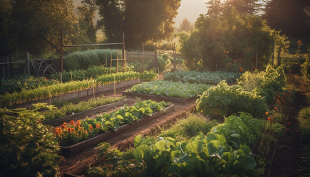 Charming garden displays a variety of colorful flowers and fresh vegetables, illuminated by warm sunlight during late afternoon, creating a serene atmosphere.