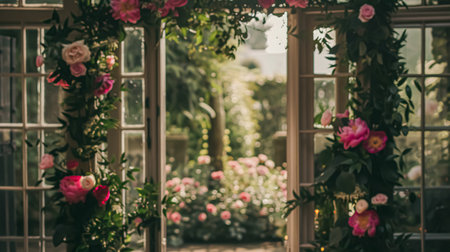 This stunning image captures a serene garden view framed by elegantly open wooden doors, showcasing lush greenery under warm sunlight, creating a peaceful atmosphere.