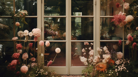 Generative AI, Beautiful aesthetic private garden with many flowers and plants, nature landscape, muted neutral colors