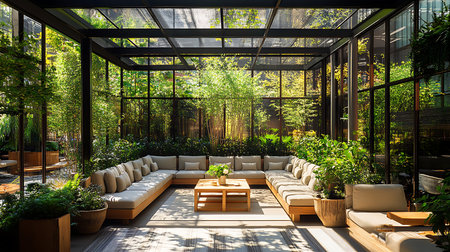 lush indoor botanical space featuring large windows, cascading greenery, and cozy seating, offering a tranquil and refreshing retreat.