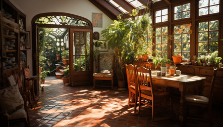Sunlit conservatory with rattan chairs and lush greenery in tranquil space. That the image is generated using AI.