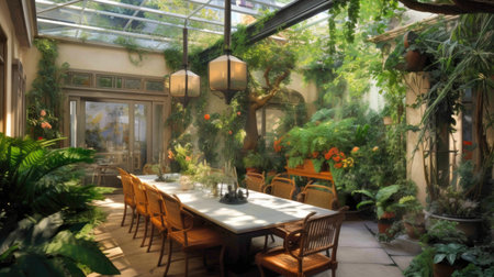 Art Deco patio or conservatory with bright green plants. Generative AI