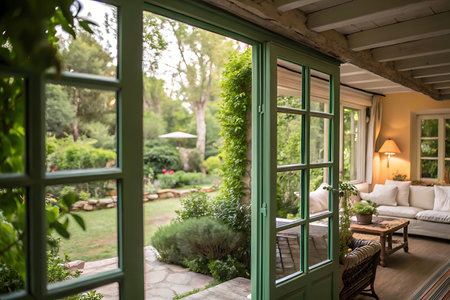 An interior space features large glass doors opening to a lush garden. The room has wooden flooring, green cabinets, and a wooden table. The open doors provide natural light and greenery. Ideal for architectural, lifestyle, and design projects, the image conveys a sense of tranquility and space.