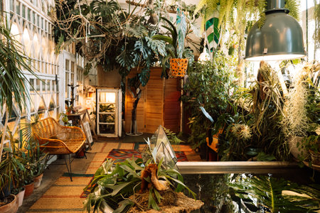 This image showcases a vibrant indoor plant oasis, featuring lush greenery, natural light filtering through large windows, and rustic decor elements. Ideal for creating a calming and inspiring atmosphere.