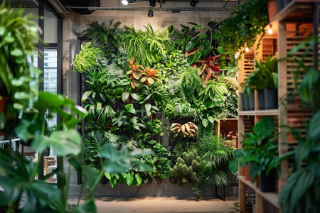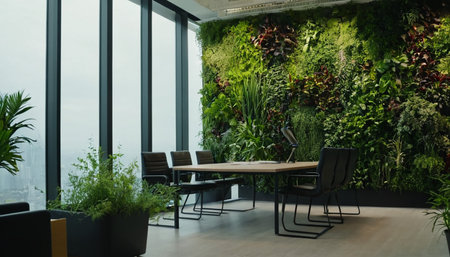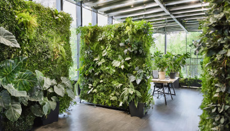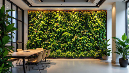 Lush Green Indoor Vertical Garden Enhances Modern Office Space with Natural Elements and Tranquil Ambiance for Productive Work Environment