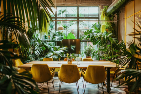 A dining table is surrounded by lush green plants in a jungle-themed conference room, A jungle-themed conference room with tropical plants and earthy tones