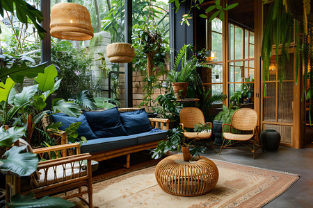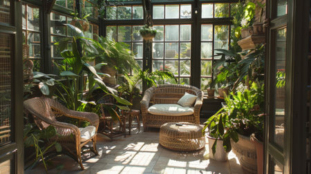 Elegant sunlit conservatory with wicker chairs and lush greenery. That the image is generated using AI.