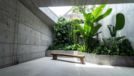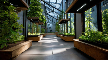 Lush plants growing in the atrium of a modern office building, creating a calming and productive work environment