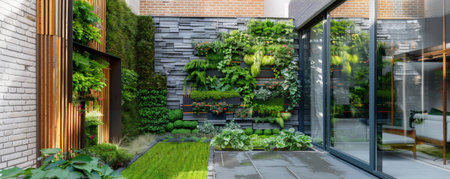 A modern landscape design with a vertical garden wall, providing both aesthetic appeal and space-saving functionality for small yards.