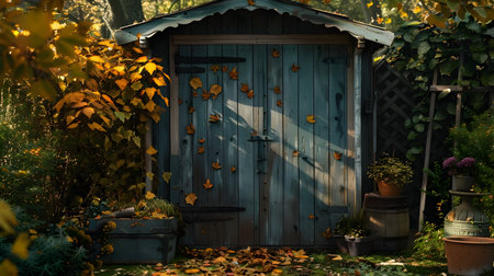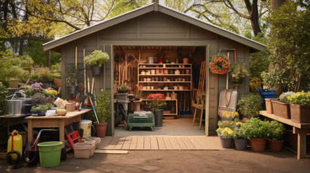 Rustic garden shed with tools and clay pots in sunny backyard. That the image is generated using AI.
