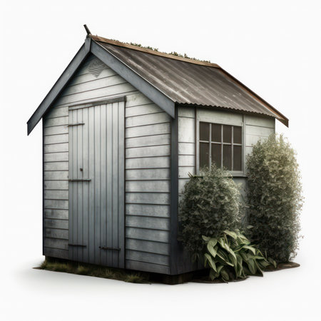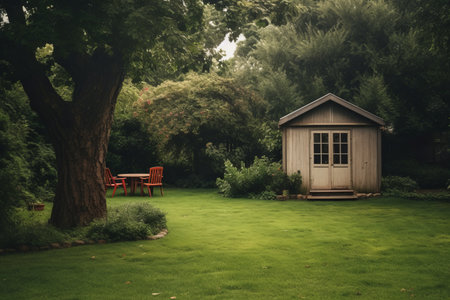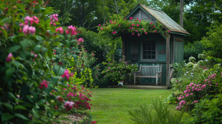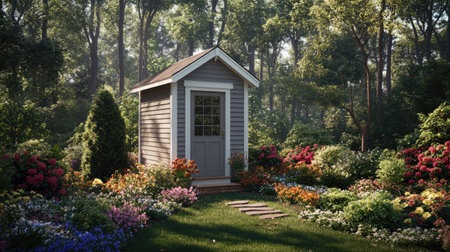 cute shed in flower garden against backdrop of beautiful trees in cozy backyard, created with generative ai