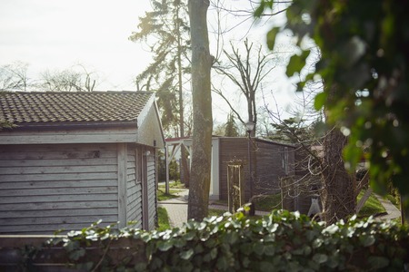 green wooden house cabin in garden vegetation and a lovely summer meadow