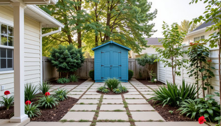 A modern backyard garden with blue storage shed and green plants creating peaceful and inviting outdoor space