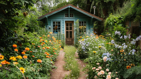 A charming garden shed nestled among vibrant flowers showcases the beauty of nature. This serene scene captures tranquility and the joy of outdoor spaces.