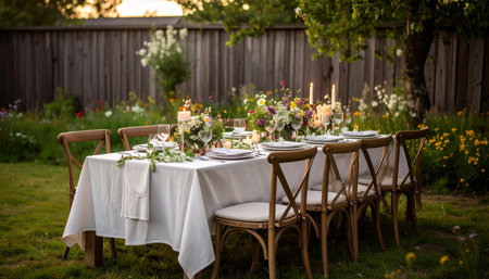 An enchanting outdoor dinner party table in a garden, featuring floral centerpieces and lit candles.
