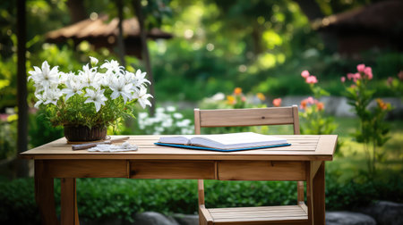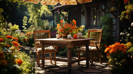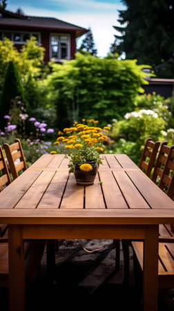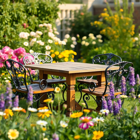 Cozy wooden table and chairs set in a scenic garden, vibrant flowers blooming, and a bright, clear sky above.