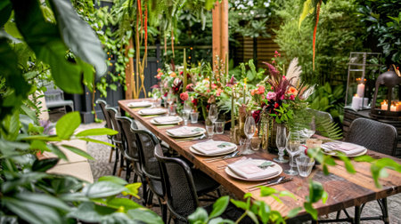 al fresco dining table surrounded by lush greenery and blooming flowers, created with generative ai