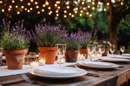 Bunches of lavender and herbs are displayed in rustic vases tied with twine, illuminated by enchanting string lights at a festive outdoor gathering.