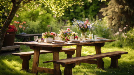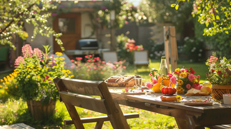 Backyard picnic table, BBQ ready, summer garden bloom, wide shot, outdoor family meals.