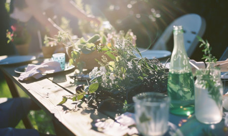 Rustic wooden table set outdoors with fresh flowers, glass bottles, and botanical elements, capturing a serene and warm garden atmosphere